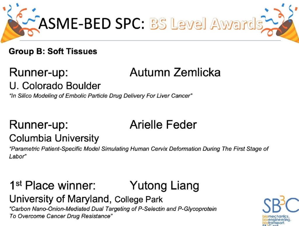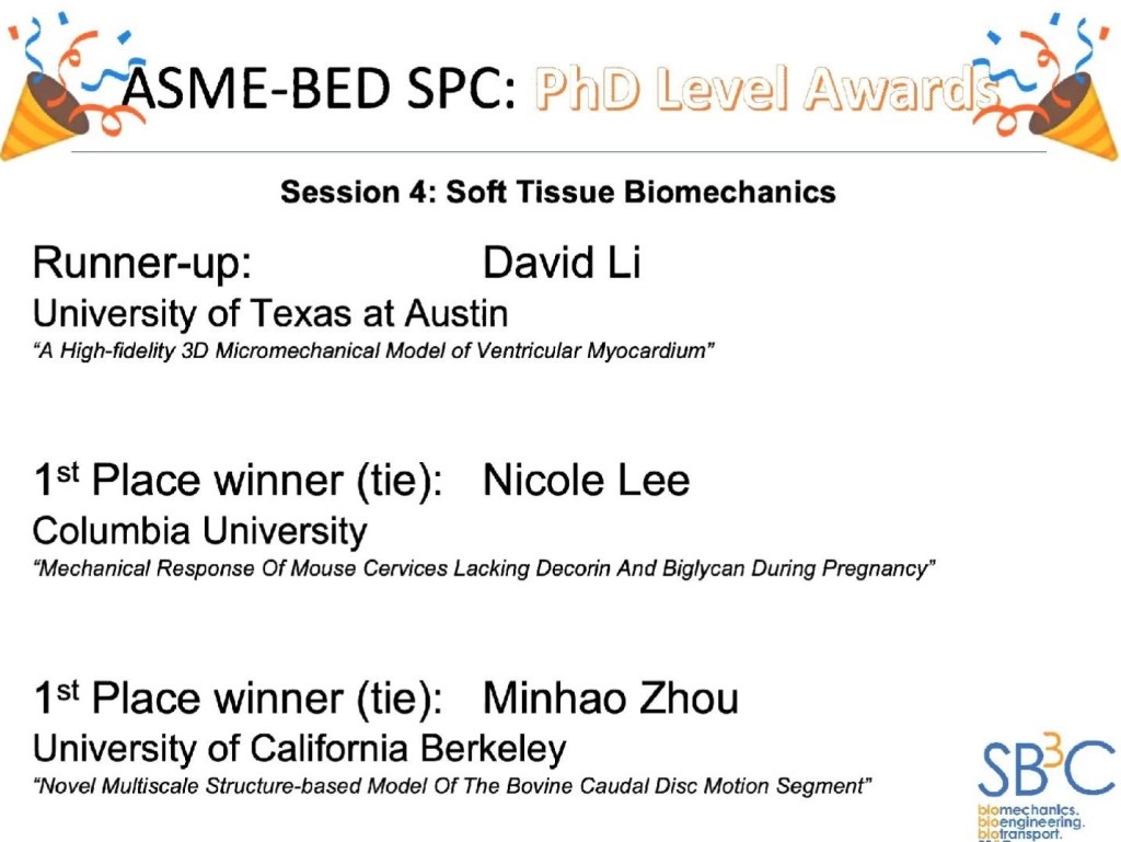 Congratulations to Myers Lab members Nicole Lee and Arielle Feder for placing in the SB3C 2021 ASME-BED Student Paper Competition! Nicole Lee tied for first place at the PhD level in the Soft Tissue Biomechanics section, and Arielle Feder got runner-up at the BS level in the Soft Tissues section. We couldn’t be more proud!