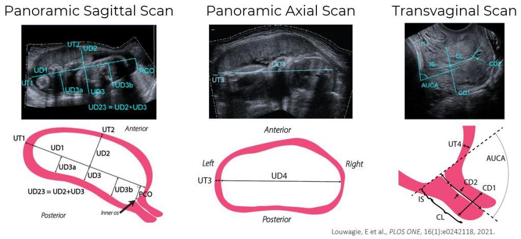 Ultrasonic dimension measurements of the maternal anatomy are collected, characterizing the overall size and shape of the uterus and cervix.