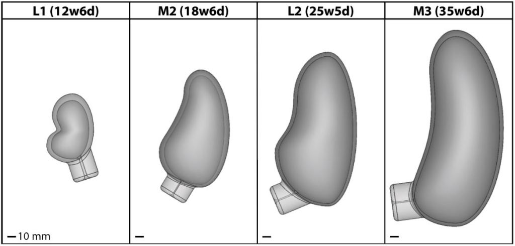 Figure 4: Computational uterine and cervical stretch simulation from late 1st to early 2nd trimester.