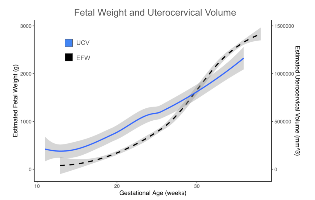 Figure 3: Estimated fetal weight and estimated uterocervical tissue volume with gestational age
